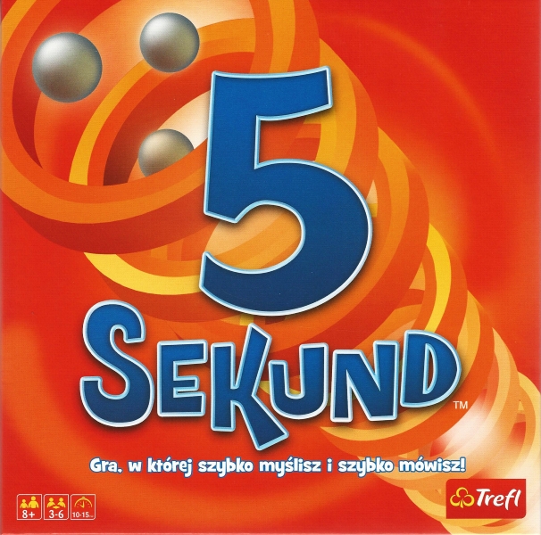 5 sekund. - Gdynia : Trefl SA, cop. 2016. - 1 pudełko zawiera : 372 karty z pytaniami (744 pytania) ; 6 kart "Następny" ; 6 kart "Zmiana" ; 6 pionków do gry ; 1 plansza do gry ; 1 specjalny czasomierz ; pudełko na karty ; instrukcja ; 26x26x8 cm.