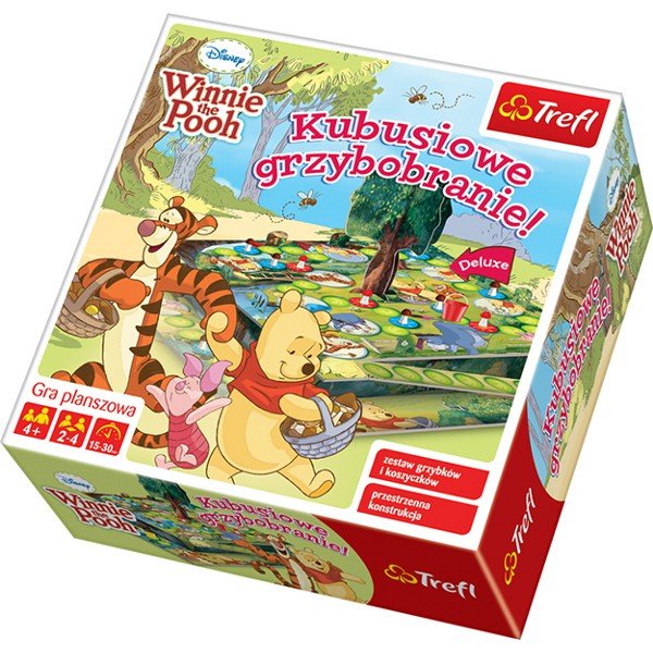 Kubusiowe grzybobranie/ - Gdynia: Trefl - 1 pudełko zawiera :Przestrzenna plansza, 4 plastikowe koszyczki, 26 grzybków ( 5 czerwonych i 21 grzybków jadalnych), kostka , instrukcja. 26x26x8 cm.