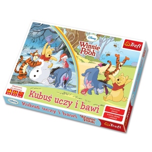 Kubuś uczy i bawi / - Gdynia: Trefl - 1 pudełko zawiera :Dwustronna gra planszowa, 2 karty z pytaniami, 24 żetony, 4 pionki tekturowe, 4 podstawki pod pionki, kostka , instrukcja. 27x39x5 cm.